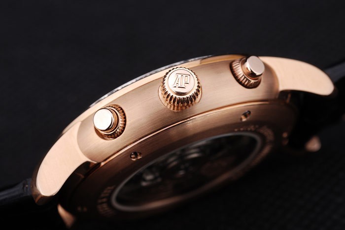 Crown : 18k steg-guldpläterade cutwork krona med Audemars Piguet logotyp och två mindre tryckknapps kronor på ömse sidor om it