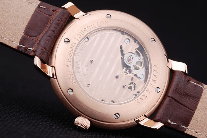 Tillbaka: 18k steg-guldpläterade skruvas ned igen med en mekanik avslöjar transparenta centrum och Jules Audemars Tourbillon engravings
