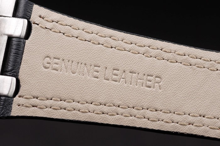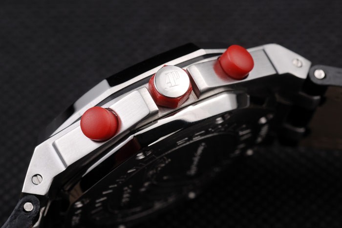 Bracelet: Heat präglade Audemars Piguet svart krokodil läderrem med dubbla röda sömmar och Audemars Piguet graverad borstad rostfritt stål utfällbar i clasp