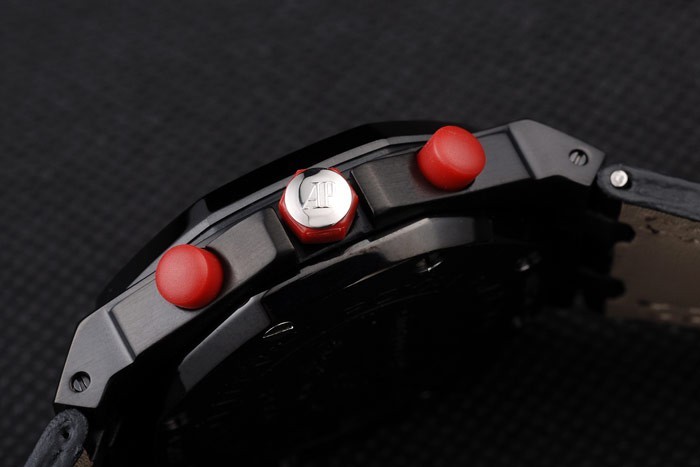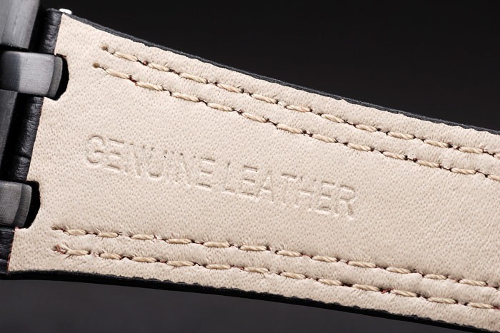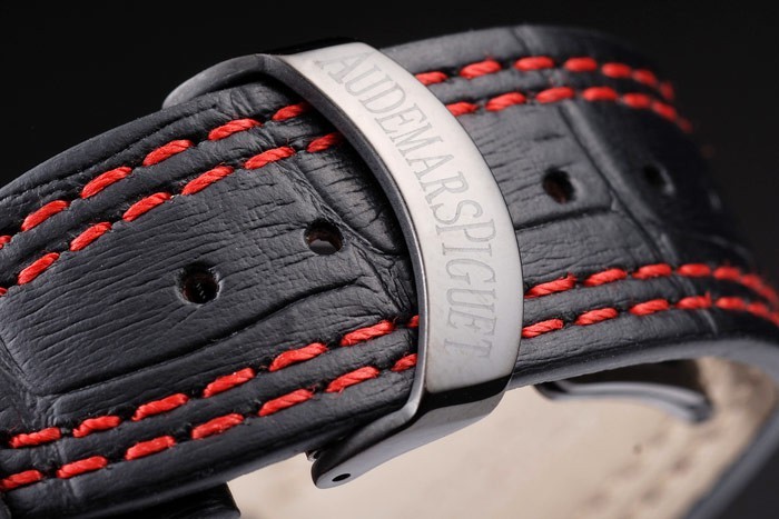Bracelet rostfritt stål: Heat präglade Audemars Piguet svart krokodil läderrem med dubbla röda sömmar och Audemars Piguet graverad jon-klädd fold-in clasp