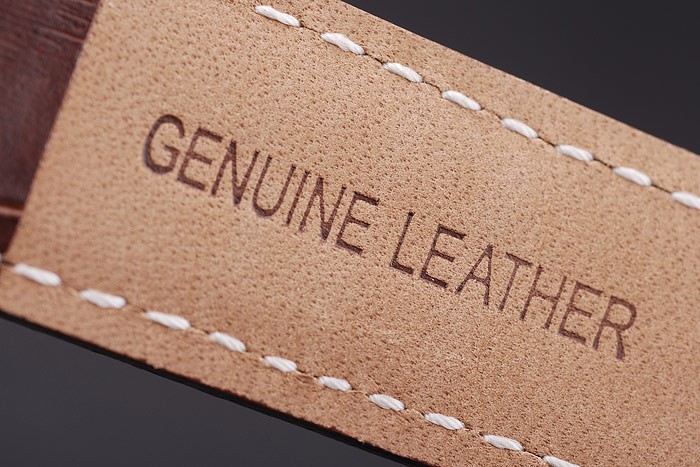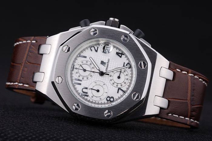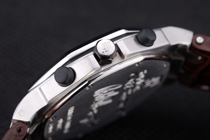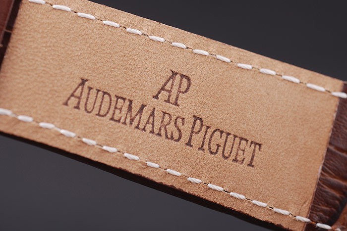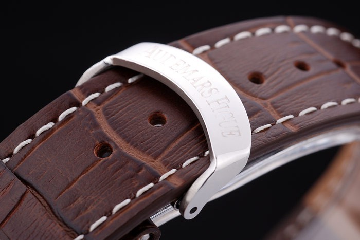 Bracelet: Mörkbrun krokodilläderband med vit tråd sömmar och värme präglad Audemars Piguet namn och logotyp och en Audemars Piguet inskriven rostfritt stål flip-over krok clasp