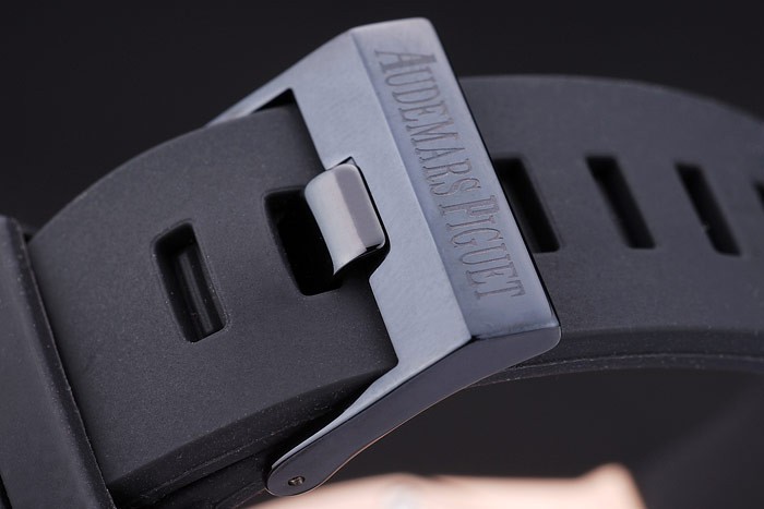 Bracelet: Svart gummiband med Audemars Piguet graverad jon-klädd krok spänne clasp