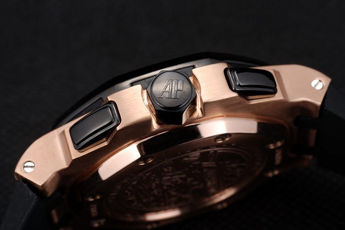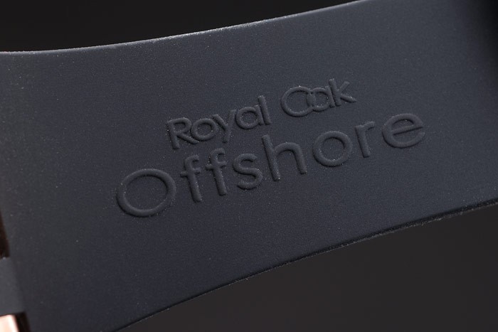 Bracelet: Svart gummiband med värme präglade Audemars Piguet Royal Oak Offshore stämpel och en Audemars Piguet inskriven jon-klädd krok-spänne clasp