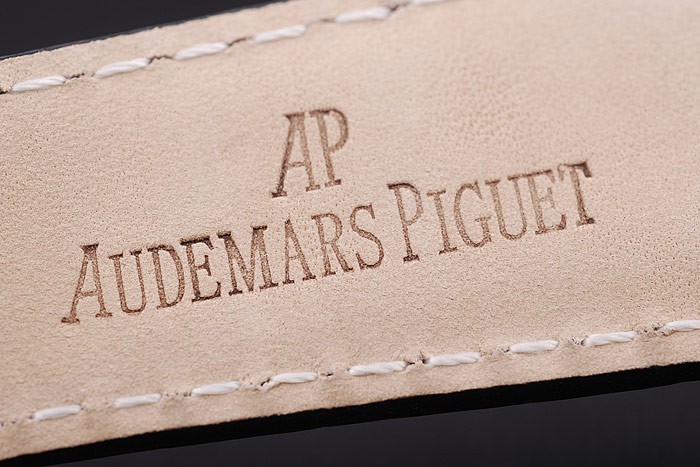 Bracelet: Svart krokodilläderband med vit tråd sömmar och värme präglad Audemars Piguet namn och logotyp och en Audemars Piguet inskriven jon-klädd flip-over krok clasp