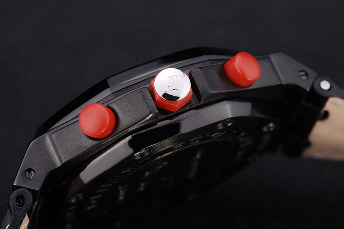 Crown: Rostfritt stål Audemars Piguet logotyp ingraverad röd emalj cutwork krona med två mindre kronorna på vardera sidan om it