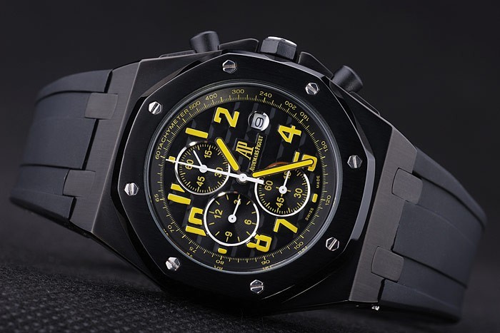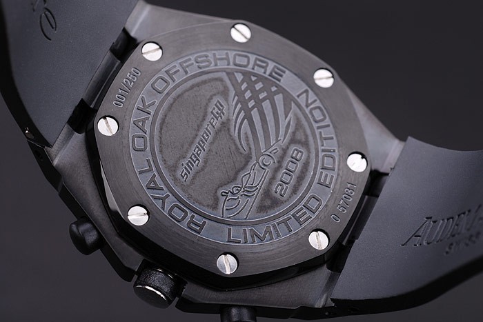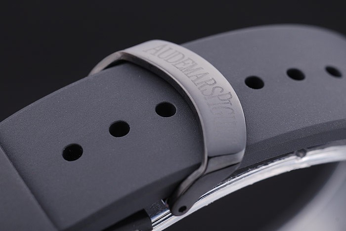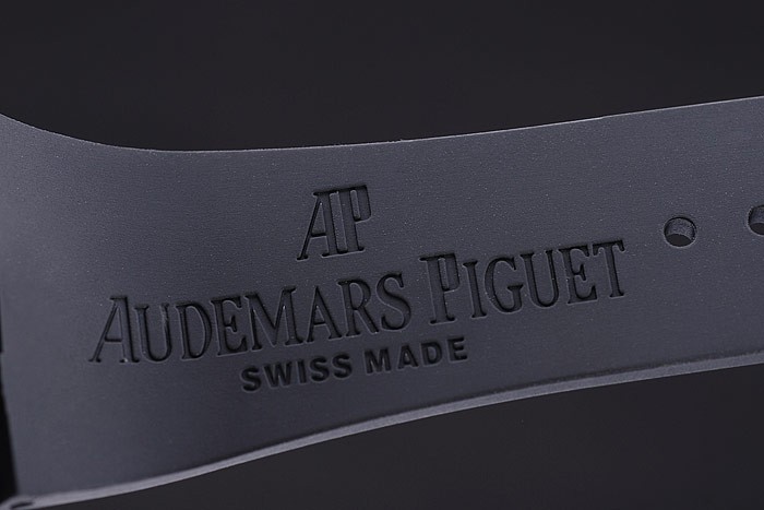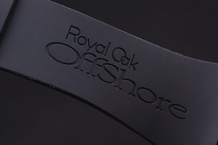 Bracelet: Svart gummiband med värme präglade Audemars Piguet Royal Oak Offshore stämpel och en Audemars Piguet inskriven jon-klädd krok-spänne clasp