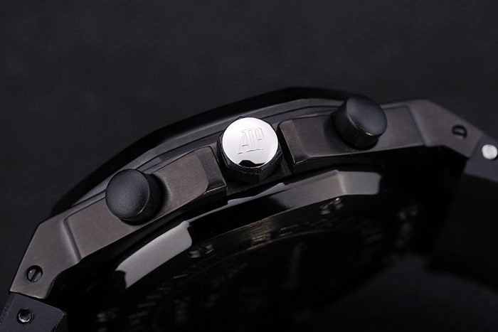 Crown: Rostfritt stål Audemars Piguet logotyp ingraverad jon-klädd cutwork krona med två små jon-klädd kronor på ömse sidor om it