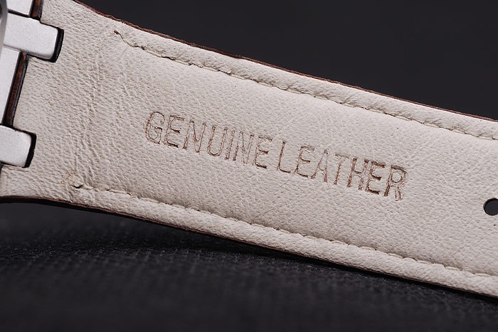 Bracelet: Brun krokodil läderrem med vit tråd sömmar och värme präglad Audemars Piguet namn och logotyp och en Audemars Piguet inskriven rostfritt stål flip-over krok clasp