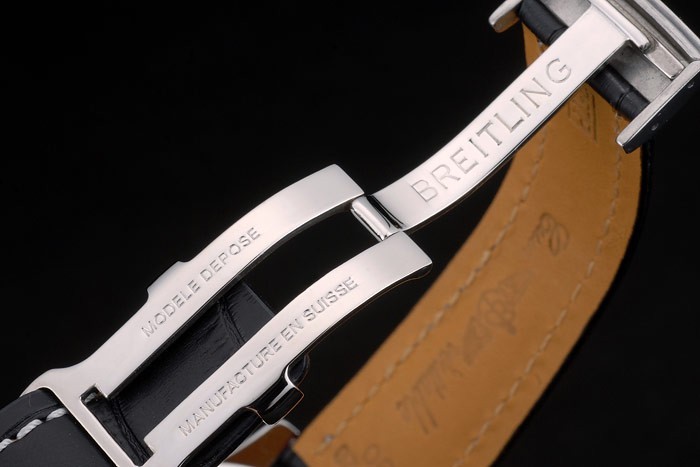 Bracelet: Breitling värme präglat svart krokodil läderrem med vit tråd sömmar och logotyp ingraverad polerat rostfritt stål utfällbar i clasp