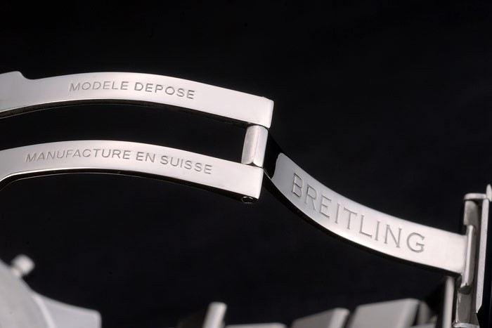 Crown: Polerat rostfritt stål cutwork krona med Breitling logotyp och en liten tryckknapp krona på båda sidor om it
