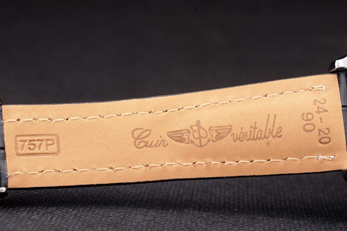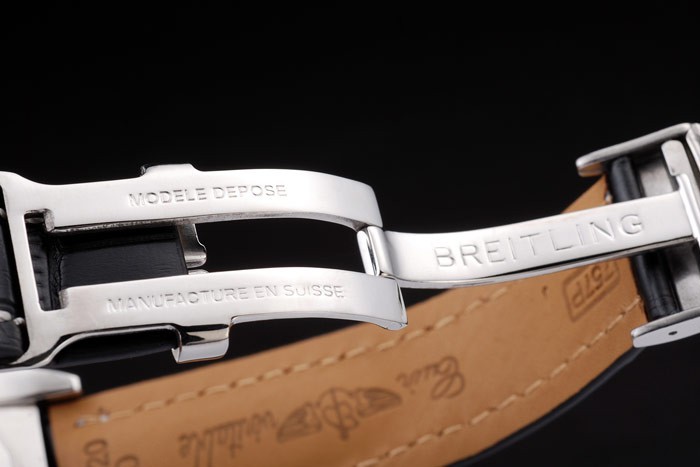 Bracelet rostfritt stål: Svart krokodilläderband med patent vita sömmar och värme präglade Breitling gravyrer och graverad rostfritt stål vika in lås med Breitling logotyp på top