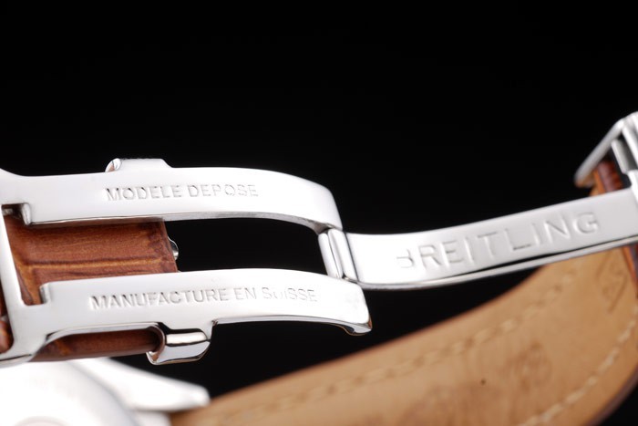 Bracelet: Brun krokodil läderrem med patent vita sömmar och värme präglade Breitling gravyrer och graverad rostfritt stål vika in lås med Breitling logotyp på top