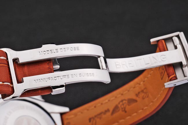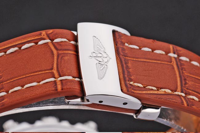 Bracelet: Russet röd hög kvalitet läder i en krokodil mönster, med kraftig vit bomull sömmar. Inre band är präglad med Breitling namn och logotyp, och har en stål spänne stängning.