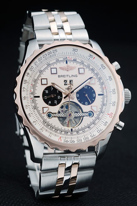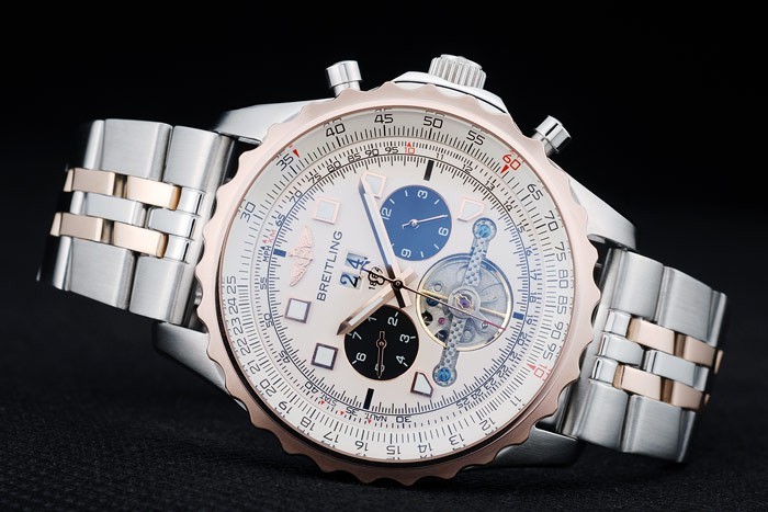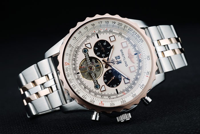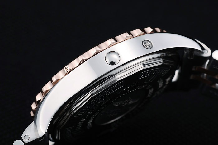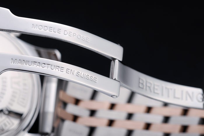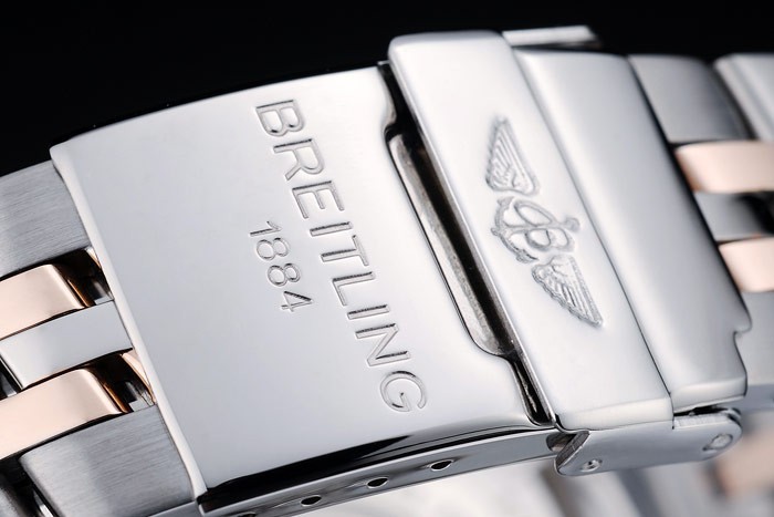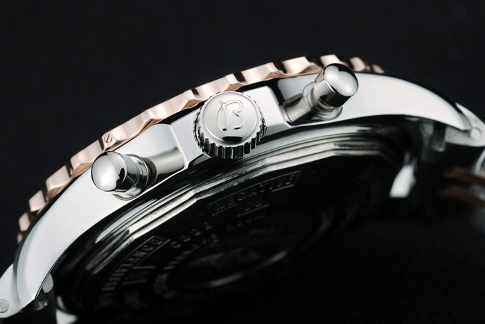 Crown: Polerat cutwork rostfritt stål krona med Breitling logotyp och två mindre tryck rostfritt stål -knappen kronor på ömse sidor om it
