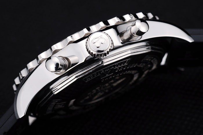 Crown: Polerat rostfritt stål cutwork krona med Breitling logotyp och två mindre tryck rostfritt stål -knappen kronor på ömse sidor om it