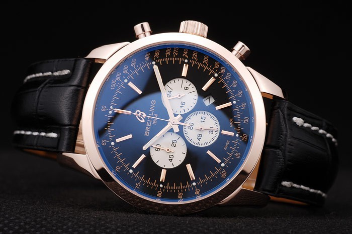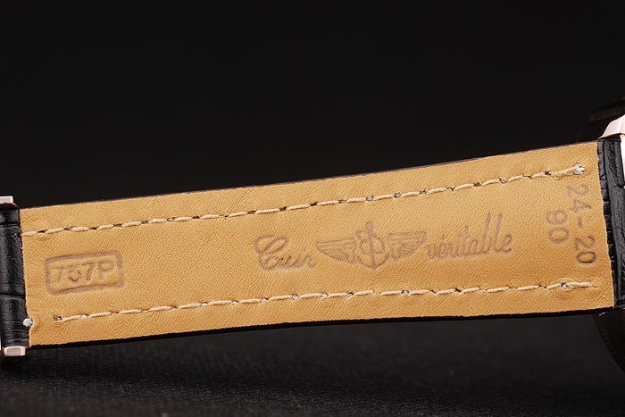 Bracelet: Heat präglade Breitling svart krokodil läderband med vit tråd sömmar och en Breitling logotyp ingraverad fold-in ros guldpläterad clasp