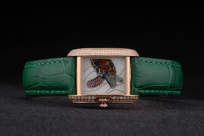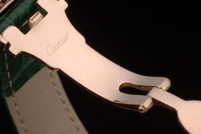 Bracelet: Cartier värme präglat grön krokodil läderrem med 18k steg-guldpläterade fold-in lås spänne