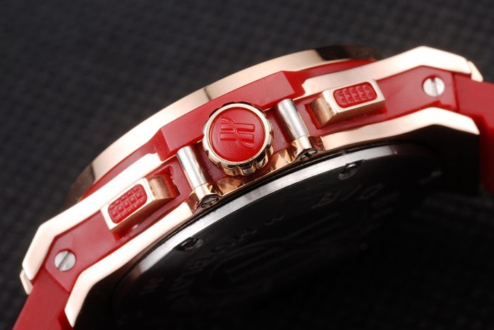 Crown: Cutwork rose-guldkrona med ”H” gravyr och två rektangulära tryckknapps kronor på ömse sidor , alla översållad med röd gummi trimmings