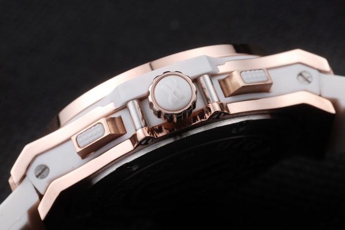 Bracelet: texturerad vit gummiband med rose-guld tryckknapp krok lås och Hublot engravings