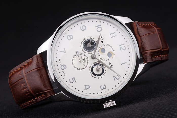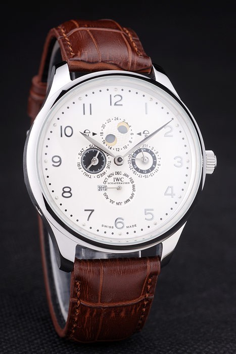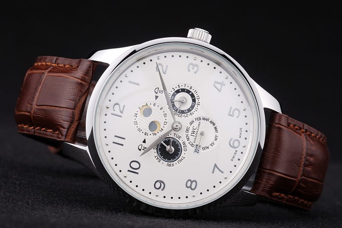Crown: Polerat cutwork rostfritt stål krona med IWC logo gravyr och två mindre runda tryckknapps kronor på ömse sidor om it