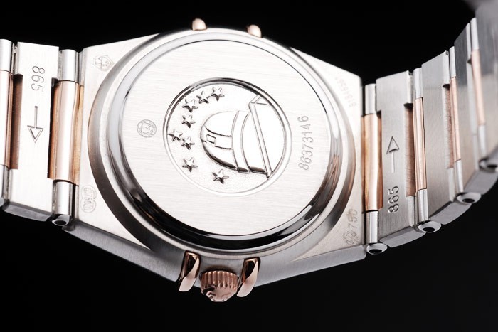 Bracelet: borstat rostfritt stål och rose-guld kedjelänk armband med dold lås och Omega logo på top