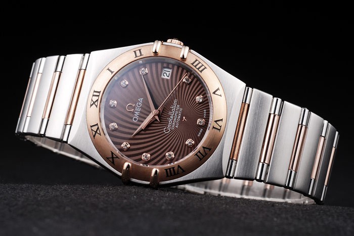 Bracelet: borstat rostfritt stål och rose-guld kedjelänk armband med dold lås och Omega logo på top