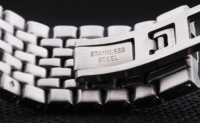 Bracelet: borstad och polerat rostfritt stål länk armband med Omega logotyp ingraverad dold clasp