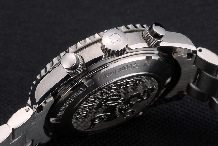 Crown: polerat rostfritt stål cutwork krona med Omega logotyp och en tryckknapp krona på vardera sidan av det plus i cutwork krona på den motsatta sidan