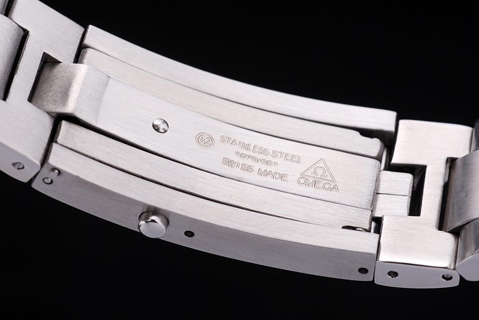 Crown: polerat cutwork rostfritt stål krona med Omega logotyp plus en liknande krona på den motsatta toppen corner
