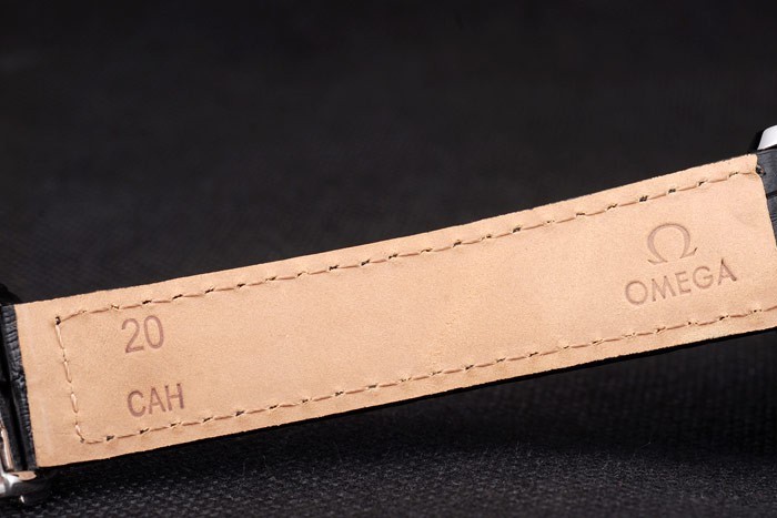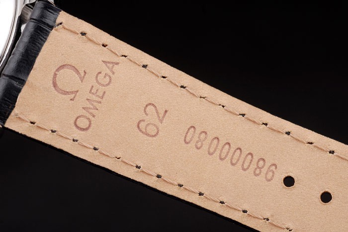 Bracelet: Svart krokodil läderrem med värme präglade Omega stämpel och rostfritt stål utfällbara i lås med Omega logotyp på top
