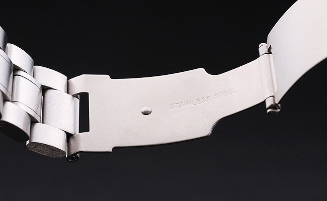 Bracelet: Borstad och polerat rostfritt länk stål armband med Omega gravyrer tryckknapp frigör driftsättning clasp