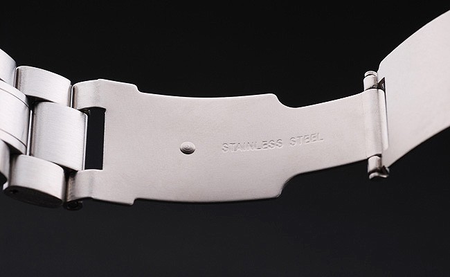 Bracelet: Borstad och polerat rostfritt länk stål armband med Omega gravyrer tryckknapp frigör driftsättning clasp