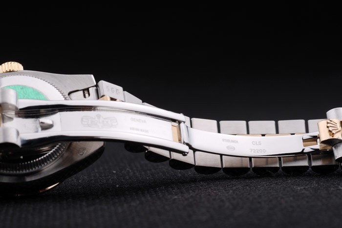 Bracelet: Två tonad trippel länk armband i polerat rostfritt stål och 18k gult guld stål med Rolex gravyr gömd lås visar Rolex logo