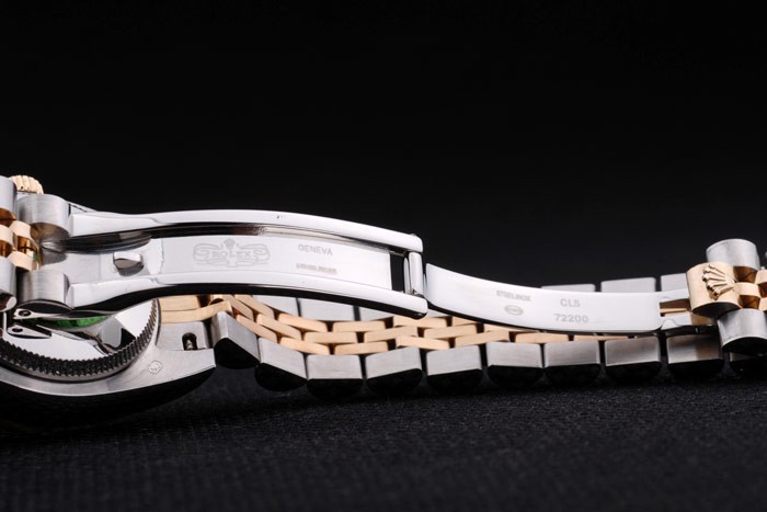 Bracelet: Två tonad trippel länk armband i polerat rostfritt stål och 18k gult guld stål med Rolex gravyr gömd lås visar Rolex logo