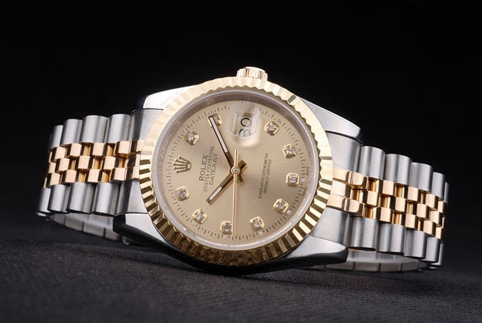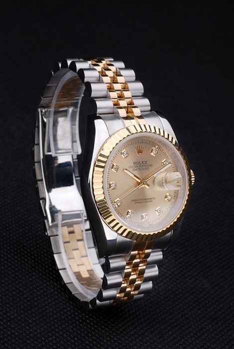 Bracelet: Två tonad länk armband i polerat rostfritt stål och 18k gult guld stål med Rolex gravyr dold spänne visar Rolex logo