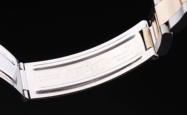 Bracelet: Två tonad länk armband i borstat rostfritt stål och 18k gult guld stål med Rolex gravyr map- i utbyggnad lås visar Rolex logo
