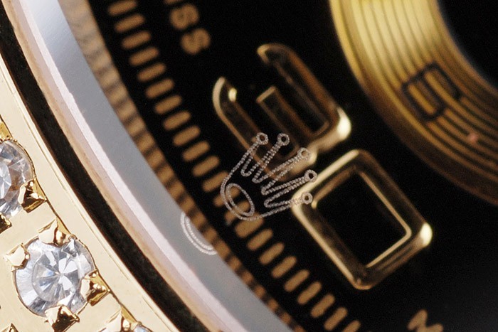 Crown: guld tonade cutwork krona med Rolex logotyp och ytterligare två kronor på ömse sidor om it