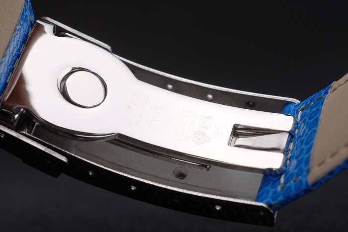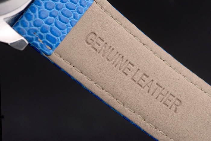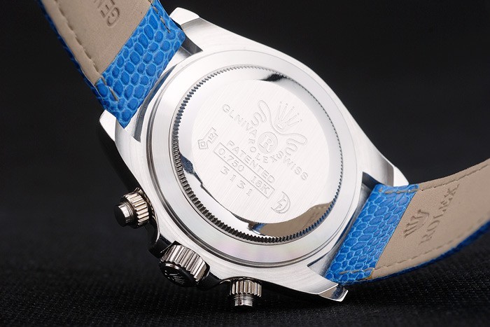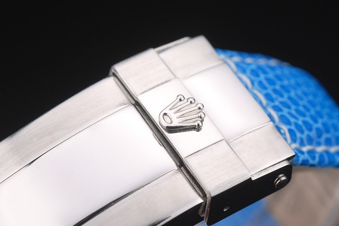 Bracelet: Blå orm läderrem med Rolex och logotyp gravyr och rostfritt stål utbyggnad lås visar Rolex logo