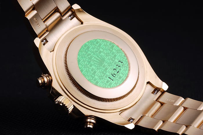 Tillbaka: Rose-guld tryck på baksidan med grön Rolex logo stamp