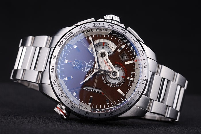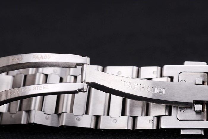 Crown: Polerat cutwork rostfritt stål krona med svart emalj Tag Heuer logotyp och två långa cutwork knapp kronor på ömse sidan av det plus en annan krona på den motsatta övre corner