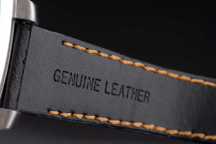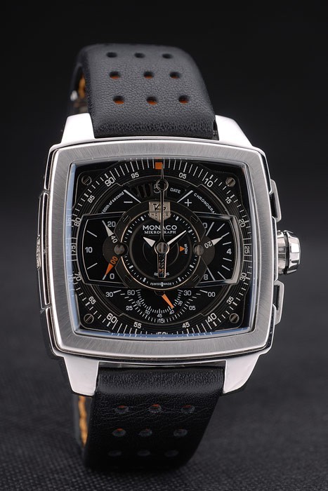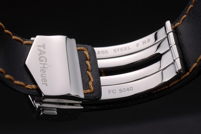Bracelet: Heat präglade Tag Heuer svart perforerat läder rem med orange sömmar på insidan och rostfritt stål utfällbar i lås med tryckfrigör feature