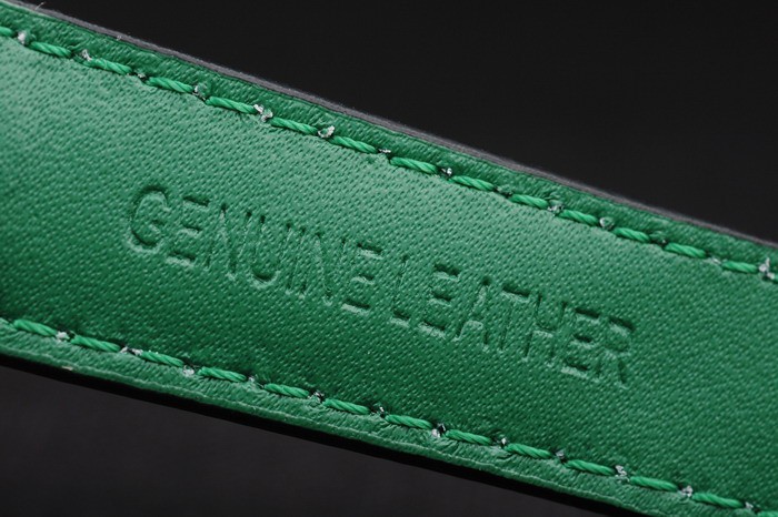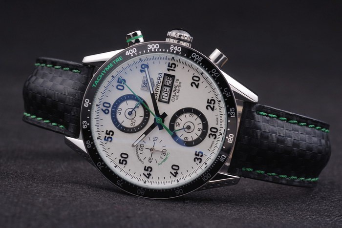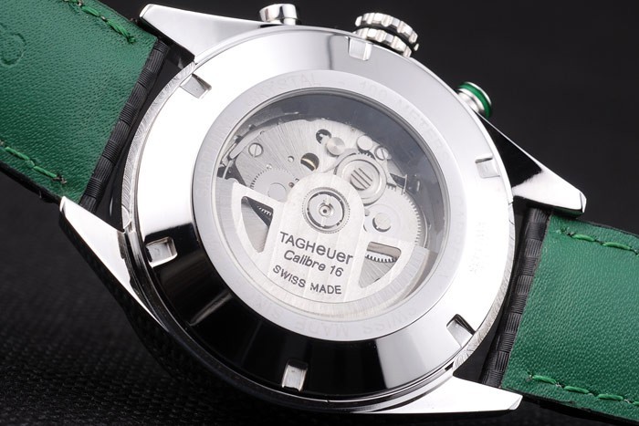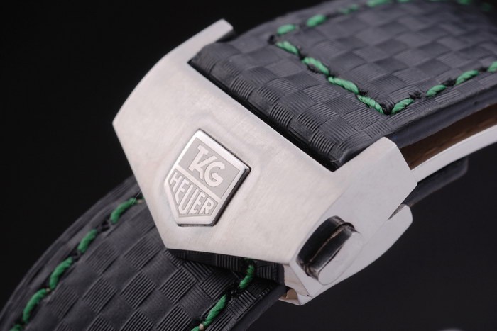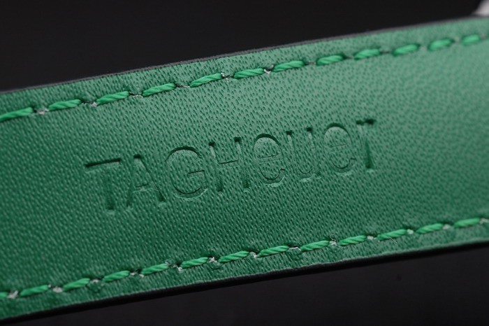 Bracelet stål: Svart läderrem med gröna färgade sömmar och en Tag Heuer märkning och borstat rostfritt stål utbyggnad clasp